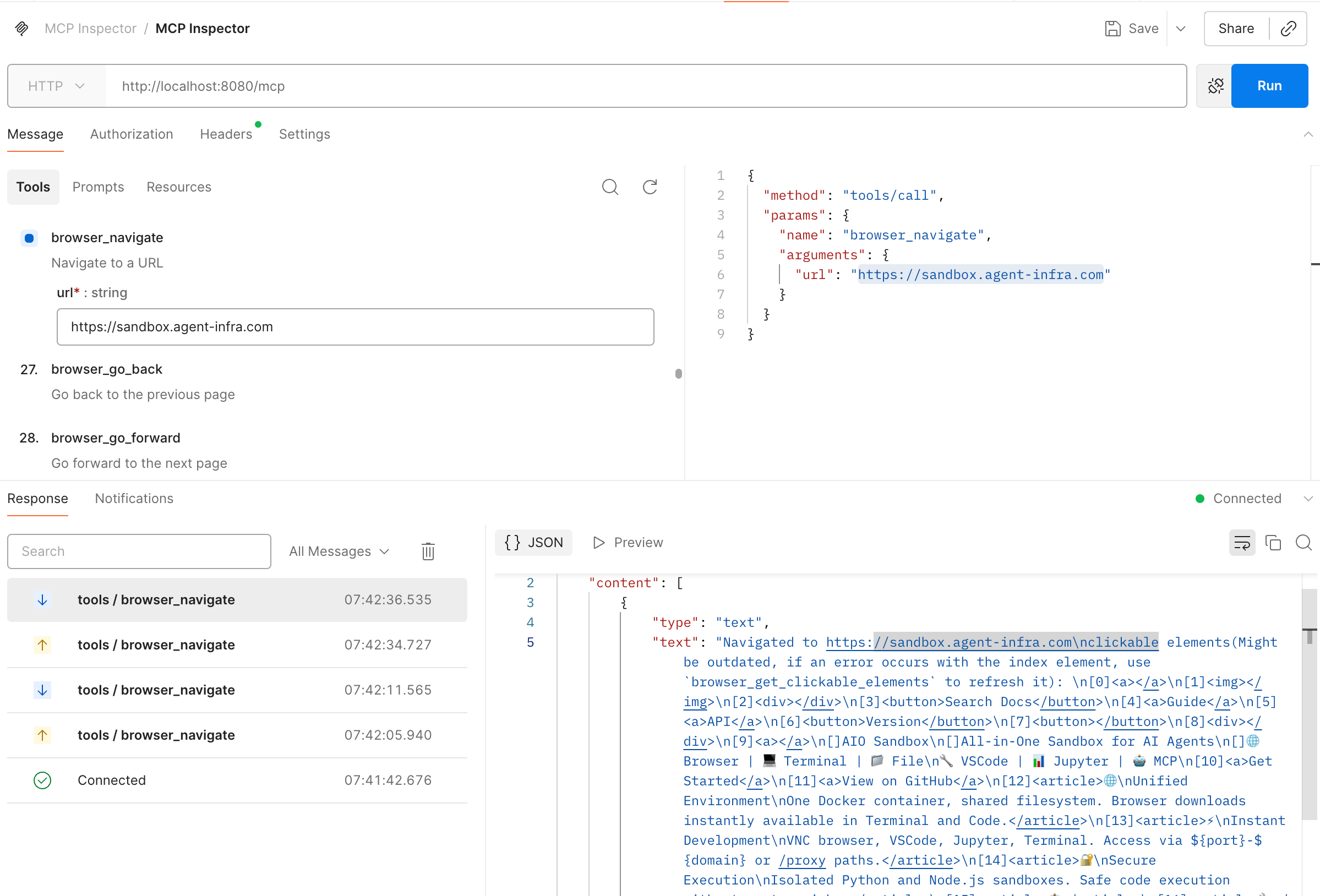 连接到 /mcp 端点后,所有以 browser_ 为前缀的工具都是浏览器相关工具,提供全面的浏览器控制功能。这些工具包括导航、交互、截图捕获等。